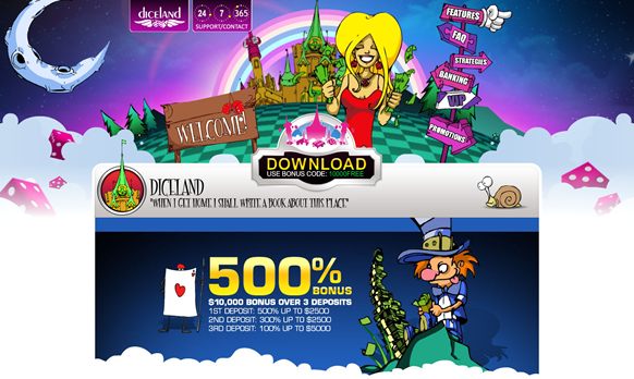 When you join Diceland Casino through this website, you will find that they have one of the largest casino bonuses available. If you use the bonus code 10000FREE you will have a $10,000 deposit bonus available. The bonus will give you three bonuses, one for each of your first three deposits. A 500% match to $2,500, a 300% match to $2,500, and a 100% match to $5,000 is what you will find after the review of Diceland Casino.