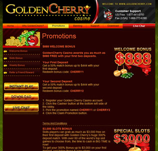 If you like casino deposit bonuses, know that we found some of the biggest bonuses online in our review of Golden Cherry Casino. Golden Cherry Casino provides three different bonuses to their new players. They have a pair of sign up bonuses that can give their players up to $888 in free cash over two deposits, which can be used on any game other than craps, American roulette, European roulette and baccarat. Their slots bonus is much higher, and it gives players access to a 300% bonus to $3,000 which can be used on any slot that isn't one of the progressive slots. There are also weekly bonuses and a refer-a-friend promotion, so extra money can regularly be collected by users who want some extra capital.