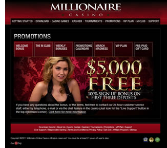 Millionaire Casino has managed to offer the large prizes that they do due to the fact that they have decided to remain within the American Market. Since the United States has the largest online gambling market in the world, it is no surprise that they have managed to incorporate such enormous prizes. Millionaire Casino requires that their players be 21 in order to participate, as you will otherwise be left out of the games. Millionaire Casino has a firm dedication to this age limit, so do not attempt to circumvent it if you are under 21.