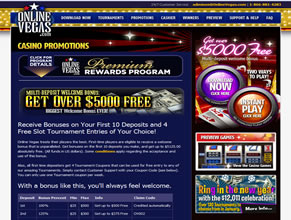 One thing that is in great supply through Online Vegas Casino is that of their bonuses. Their online casino bonuses provide players with ten different cash bonuses and several bonuses that provide free access to tournaments. Their cash bonuses will benefit your first ten deposits. These are bonuses begin with one that is credited automatically. A 100% to $500 match bonus is the first promotion of its kind. The second deposit you make is even better, giving a 125% match bonus to $300 dollars. The third is a 150% match bonus, while the rest, all except the last one, are 25% matches. The final bonus in their chain is a 200% match. A total of $5K can be collected, as well as free access into four tournaments of your choice. See all Online Vegas Casino Bonuses & Codes.
