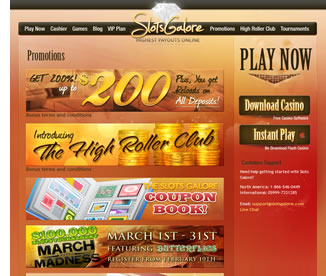 Slots Galore Casino is well known for their bonuses. You will see that they offer their players a 200% match, which gives up to $200 on your first deposit. They have also managed to incorporate reload bonuses into their service, giving players that same 200% match on all deposits made. They have made it a point to offer their players some of the most profitable bonuses online, and they have even decided to incorporate a VIP program that can be worth thousands upon thousands of dollars. Keep your eyes on their cashier for more money through the legal gambling service that they offer.